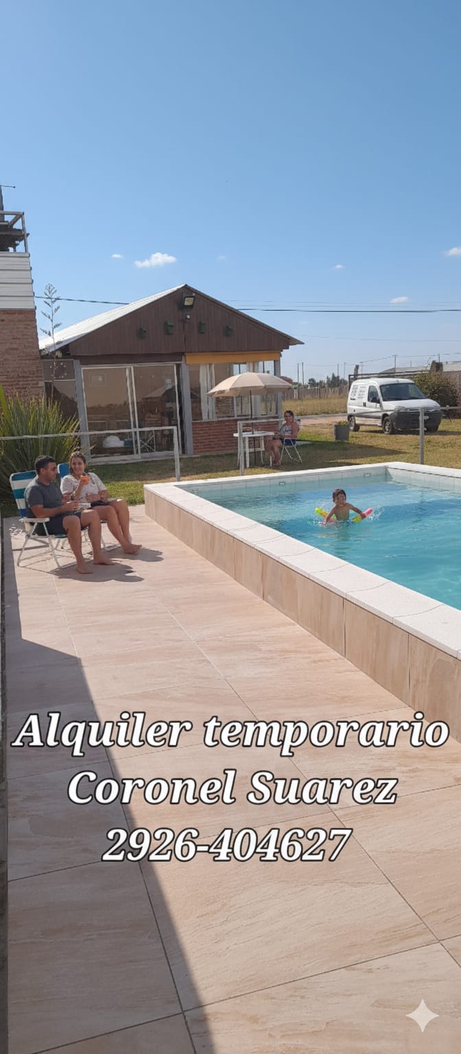 🏡 ¡Hola! Un gusto saludarte. Somos tu alojamiento temporario en Coronel Suárez. Queremos ofrecerte el mejor lugar para tu estadía o un día de relax. 🛌 Opción 1: Hospedaje (Cabaña hasta 4 personas) Nuestra cabaña está totalmente equipada para que disfrutes sin preocupaciones: 🛏️ Comodidades: Cabaña hasta 4 personas con camas de una plaza. ¡Ropa de cama incluida! 🍳 Equipamiento: importante la cabaña NO cuenta con cocina ni anafe para cocinar , solo microondas para calentar alimentos. Cuenta con pava eléctrica, vajilla completa, freezer, Smart TV, Wi-Fi. ❄️🔥 Climatización: Aire acondicionado (frío/calor) y estufa ecológica a leña. 🔥 Exteriores: Fogón y "fogón sulky". 🚗 Seguridad: Lugar interno para guardar el auto y patio monitoreado. ⚠️ Importante para tu reserva de Cabaña: Costo: $------- por noche (hasta 4 personas). Horario (Check-in/out): Ingreso a partir de las 11:30 hs. y egreso a las 10:00 hs. A tener en cuenta: El huésped solo debe traer sus toallas. La ropa de cama está incluida. Regla: No se aceptan más huéspedes de los comprometidos en la reserva. 🏊 Opción 2: Día de Piscina y Relax (Pase por el día) Ideal para disfrutar en familia o amigos: 👨👩👧👦 Capacidad: Hasta 10 personas. Costo: $------- por el día. Horario: Ingreso a partir de las 11:00 hs. y egreso a las 22:00 hs. 🔑 Proceso de Reserva Seña: Para que quede reservado, se requiere el pago del costo de un día/noche como seña. Pago Total: El saldo restante se abona en el momento de la entrega de la llave. Contacto: La reserva se confirma directamente por WhatsApp. Ante cualquier duda, estamos a tu disposición. Atentamente, Saúl Arcucci 📲 Cel: 2926-404627 (Mejor por WhatsApp)